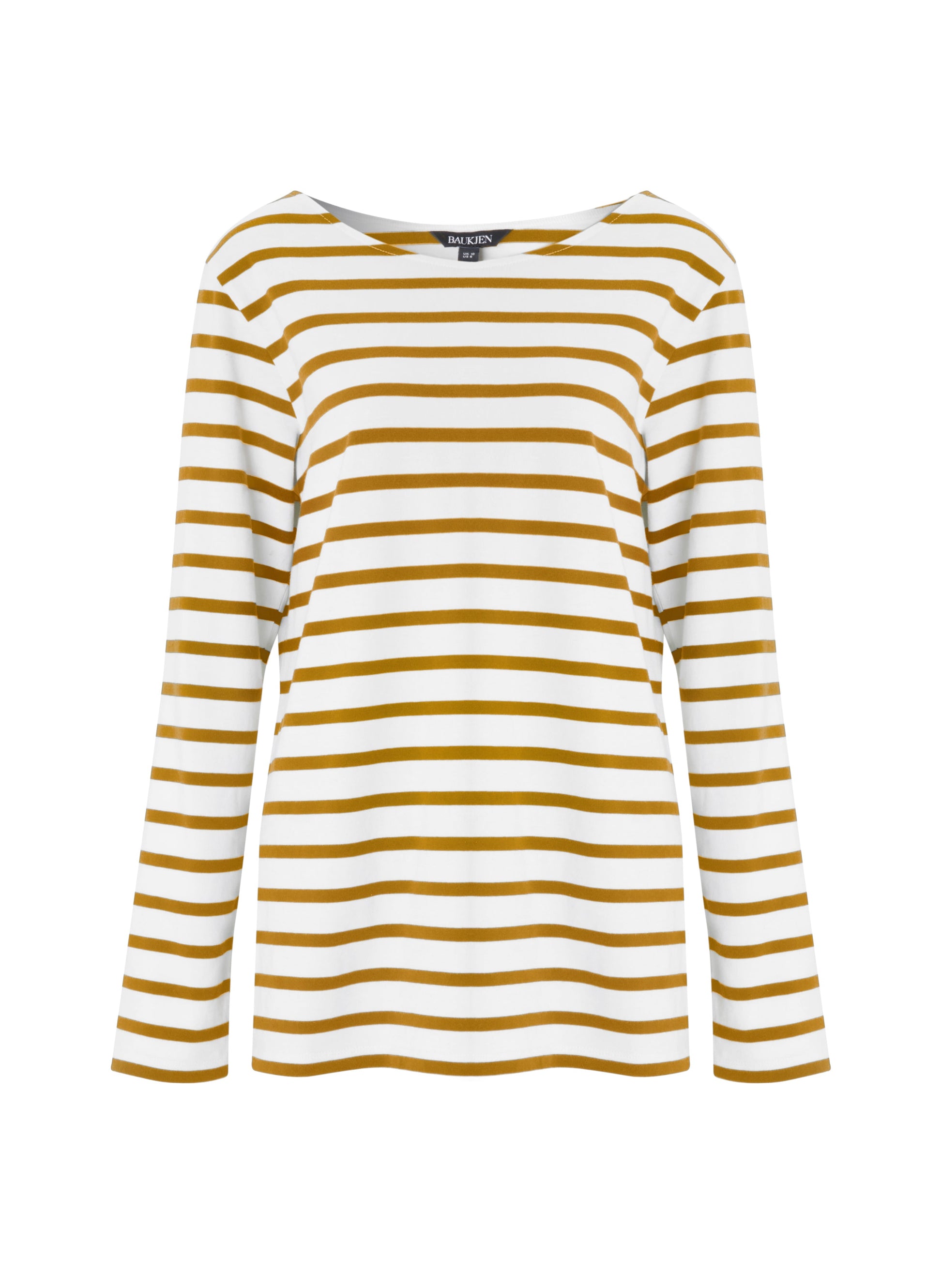 Ashley is our best-selling Breton-inspired top. We update the stripes seasonally, and this soft white and ochre pairing must be one our favourites! Made from a heavyweight organic cotton jersey to give it structure, it’s truly versatile. As well as with jeans, we’ll be styling this version with khaki cargo pants and indigo denim.