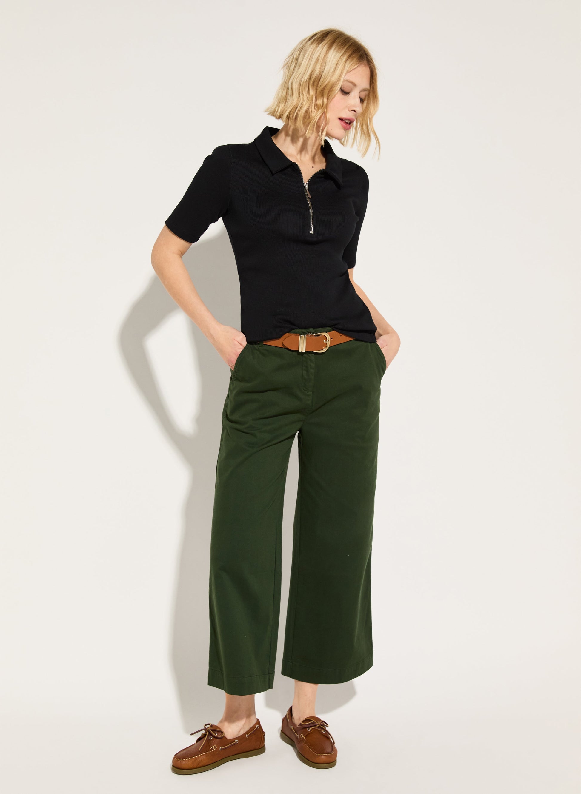 For a considered alternative to denim through spring and summer, make a beeline for the Brielle Trousers in deep khaki. Hardworking and so versatile, they are crafted in organic brushed cotton with plenty of stretch for comfort. The wide-leg crop shape goes with trainers and loafers, and tees and shirts. Fitted around the waist, bum and hips, they feature belt loops and pockets.