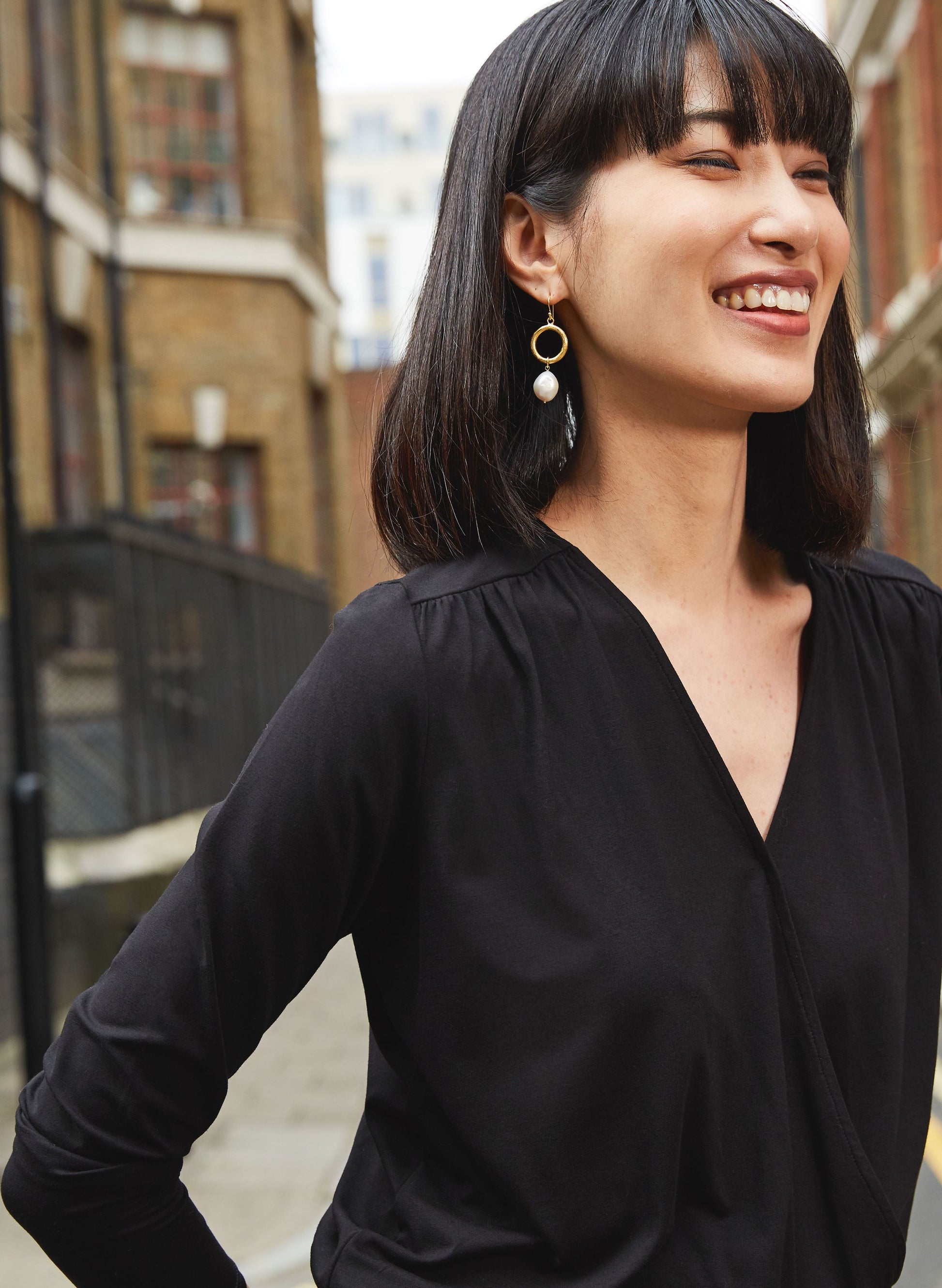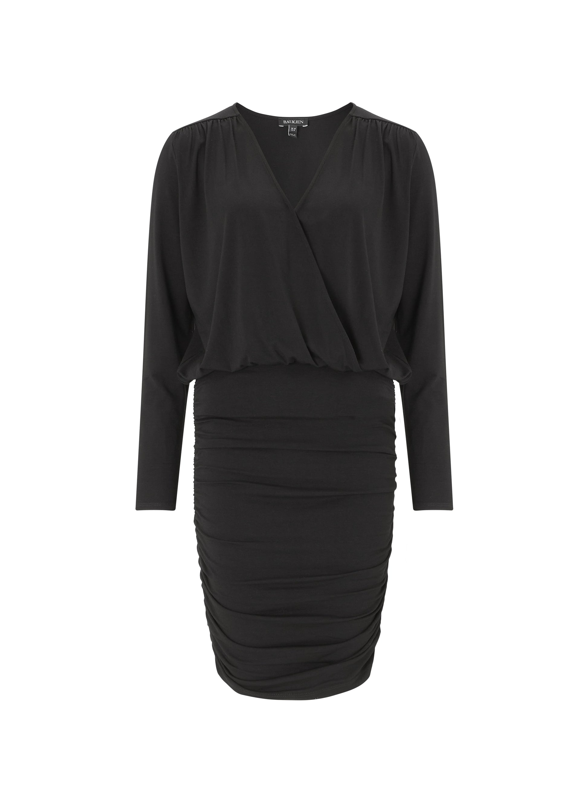 A voluminous top half with gathering in shoulders and a loose, fixed wrap front, gives this LBD a nod to the 80s cocktail dress. Although we love its “modest mini” length (the hem lands just above the knee), its elasticated ruching up the side seams makes for a gathered look which also affords just the right amount of length adjustment, if needs be.