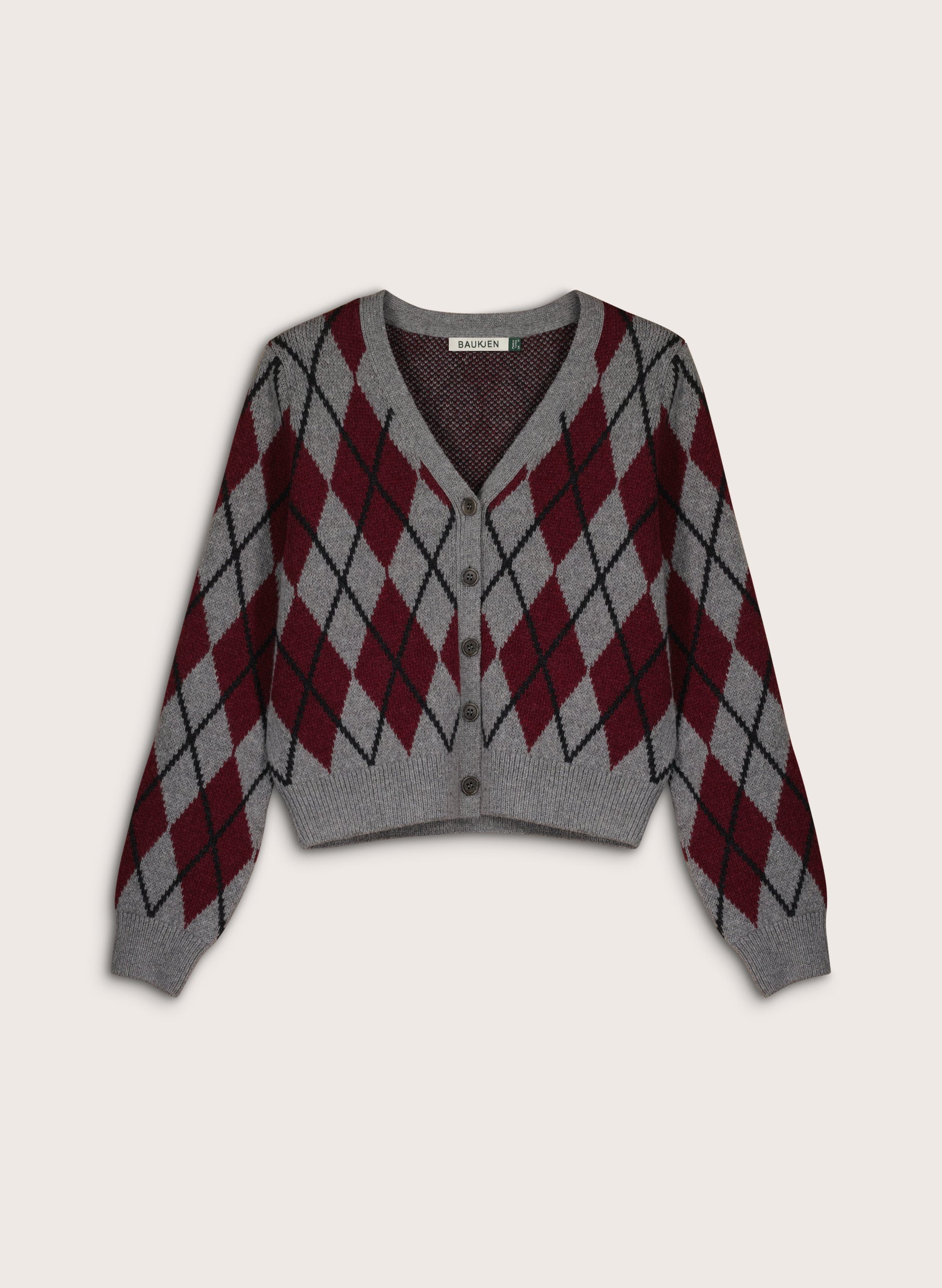 The Clemence Cardigan is our take on classic Argyle knitwear. We’ve cut this statement style into a neat, cropped fit with a v-neck so that as well as styling it over base layers, you could wear it on its own as a top (we’ll be reaching for a camisole underneath - and leather trousers). Crafted in recycled wool, its grey and burgundy pattern promises to boost your mood while adding interest to your favourite separates.