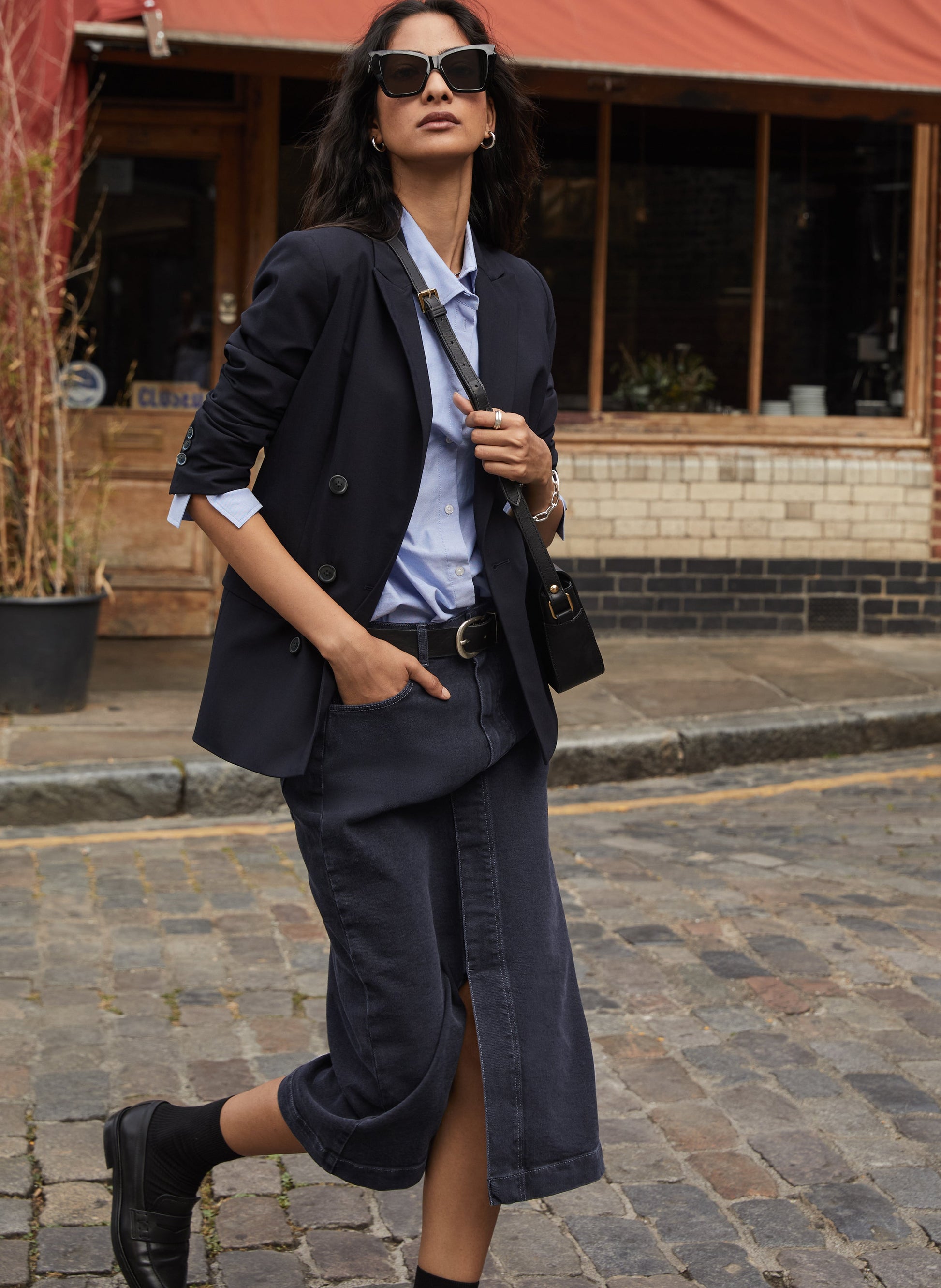 The hot-ticket item right now according to our Design Director Natalie. A long-line denim skirt. In organic cotton of course. Emilia is a cool alternative to jeans, with a split up the front for a flash of leg and easy movement. It’s a versatile piece which hugs the waist and hips before tapering out into a chic column shape. So versatile, you can dress it up with loafers and a shirt, or down with a sweater and sneakers.
