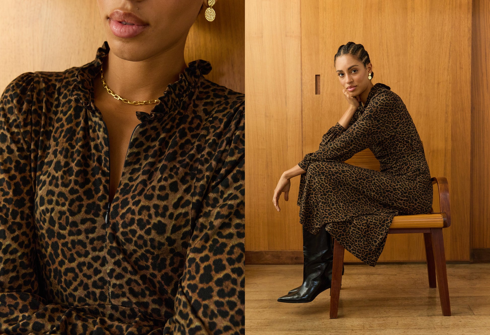 Our Hannah Midi Dress is an easy update for your work wardrobe. Crafted in our signature stretchy jersey with a dark leopard print, it’s high on comfort and style. The neckline is adorned with a pretty, Victoriana-inspired frill and the full sleeves are gathered into the cuffs and shoulders. The front section opens with a concealed zip, so it simply pulls on. Cut for a waist-skimming, fit-and-flare silhouette with an elastic panel to the back, it will take you from desk to dinner seamlessly.