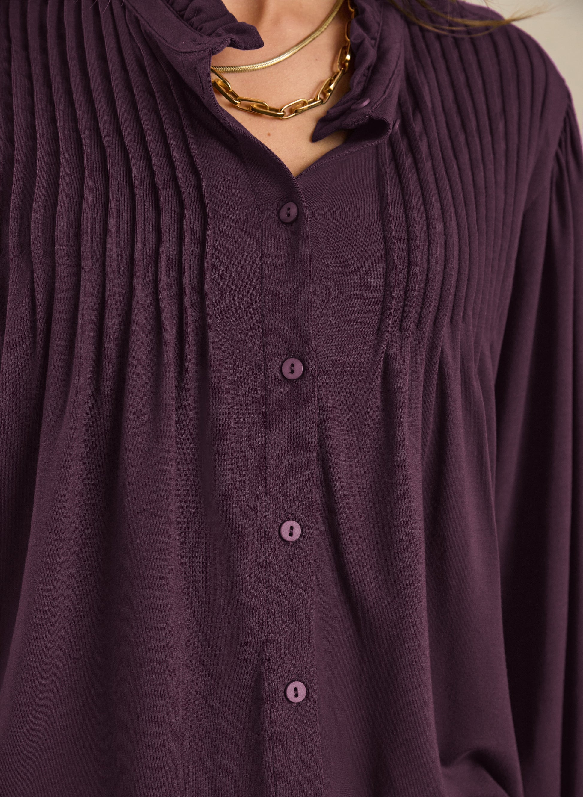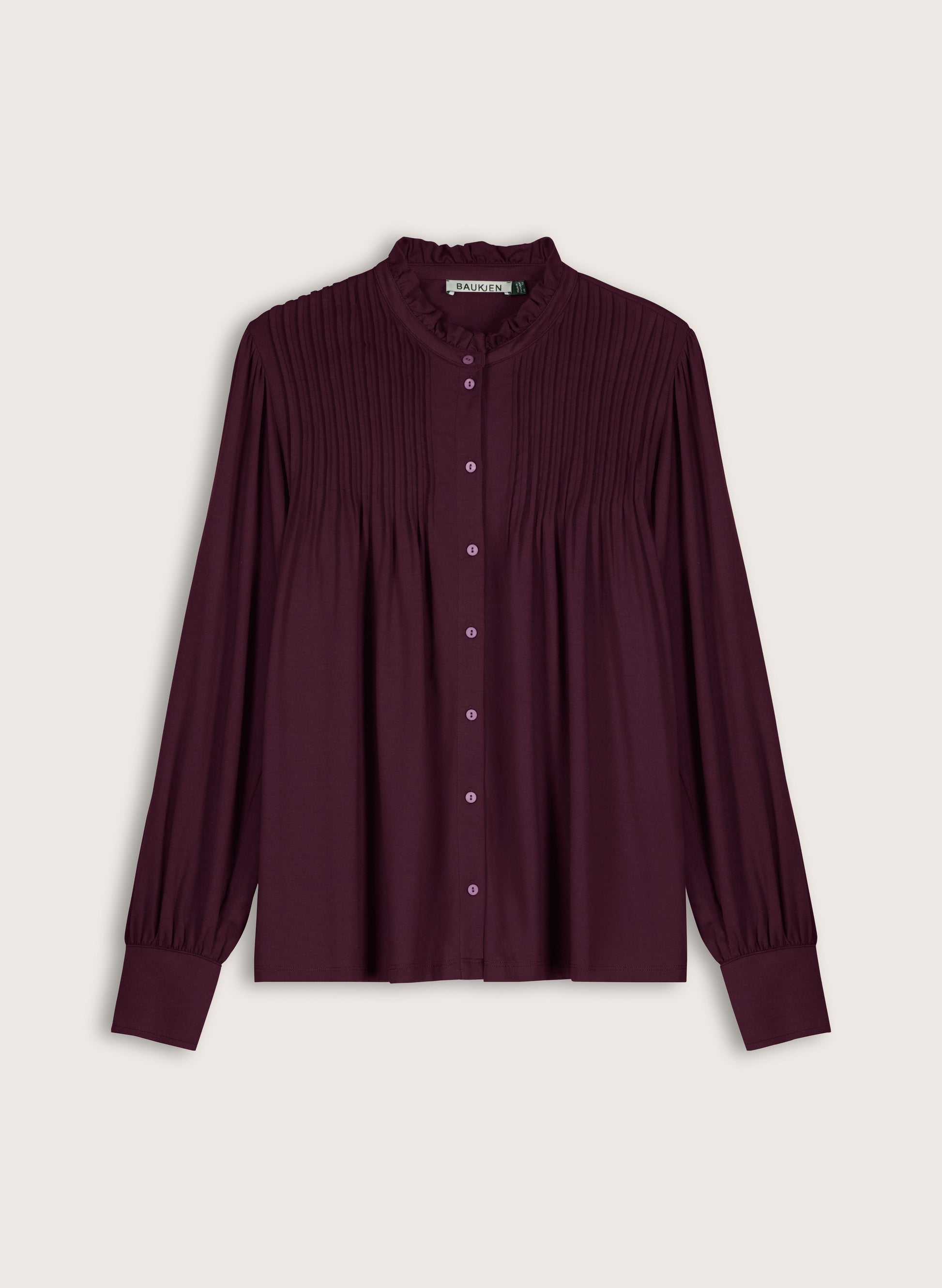 Our hugely popular Imken Blouse couples the comfort of our signature stretchy jersey with the elegance of a blouse. Featuring neat pintuck detailing along each shoulder, a ruffled collar and gathering into the shoulders and cuffs, it’s unapologetically feminine. In rich plum, it’s a failsafe for both work with tailored separates, or tucked into denim come weekends.