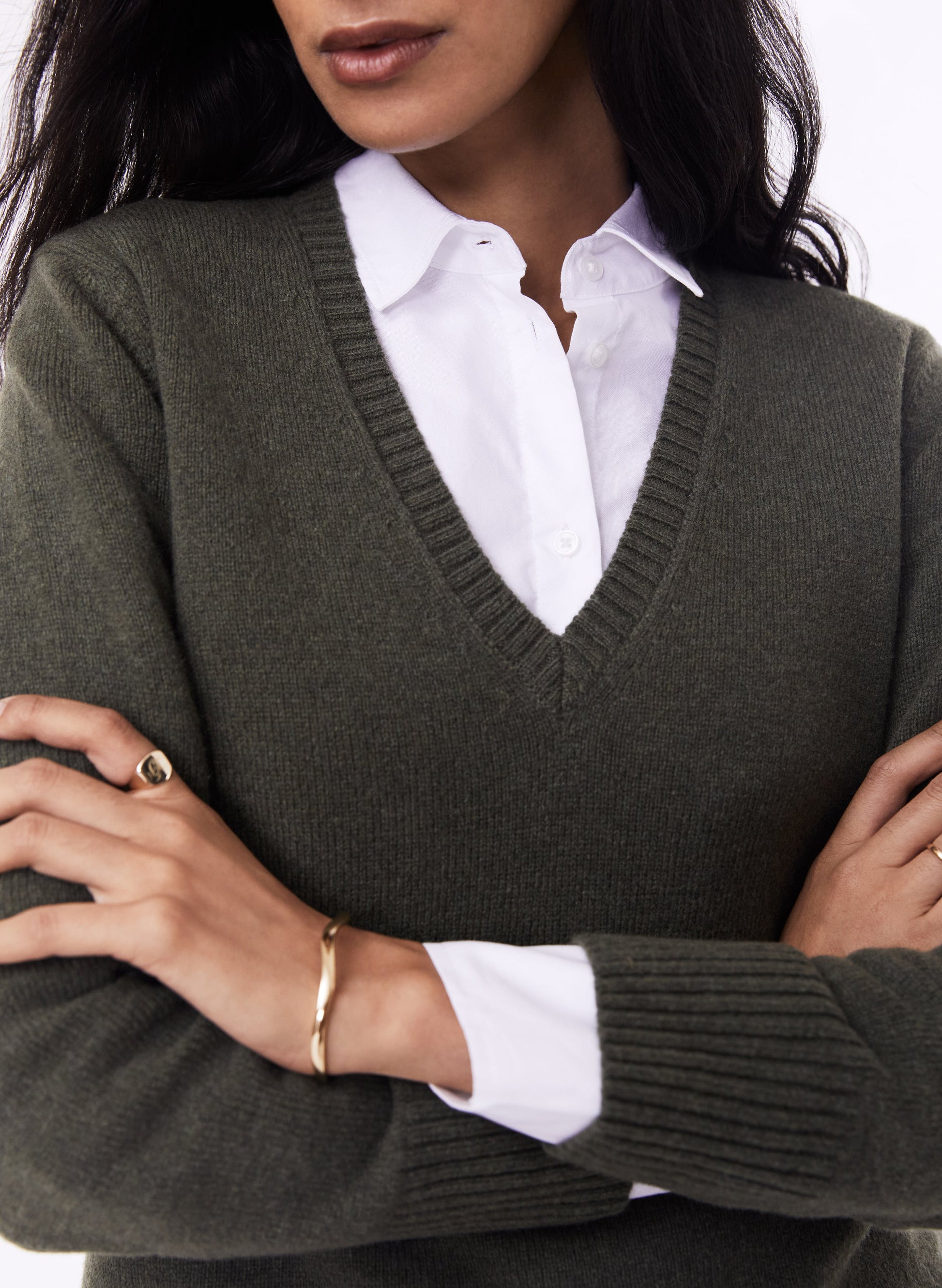 A classic v-neck jumper will never let you down! Our Janet style is woven from a blend of recycled wool yarns, with ribbed detailing around the cuffs, neck and hem. You could wear it on its own or styled with a crisp shirt underneath for extra warmth. Be sure to check out the back, which features a contrast ecru stripe for that extra-special detail.