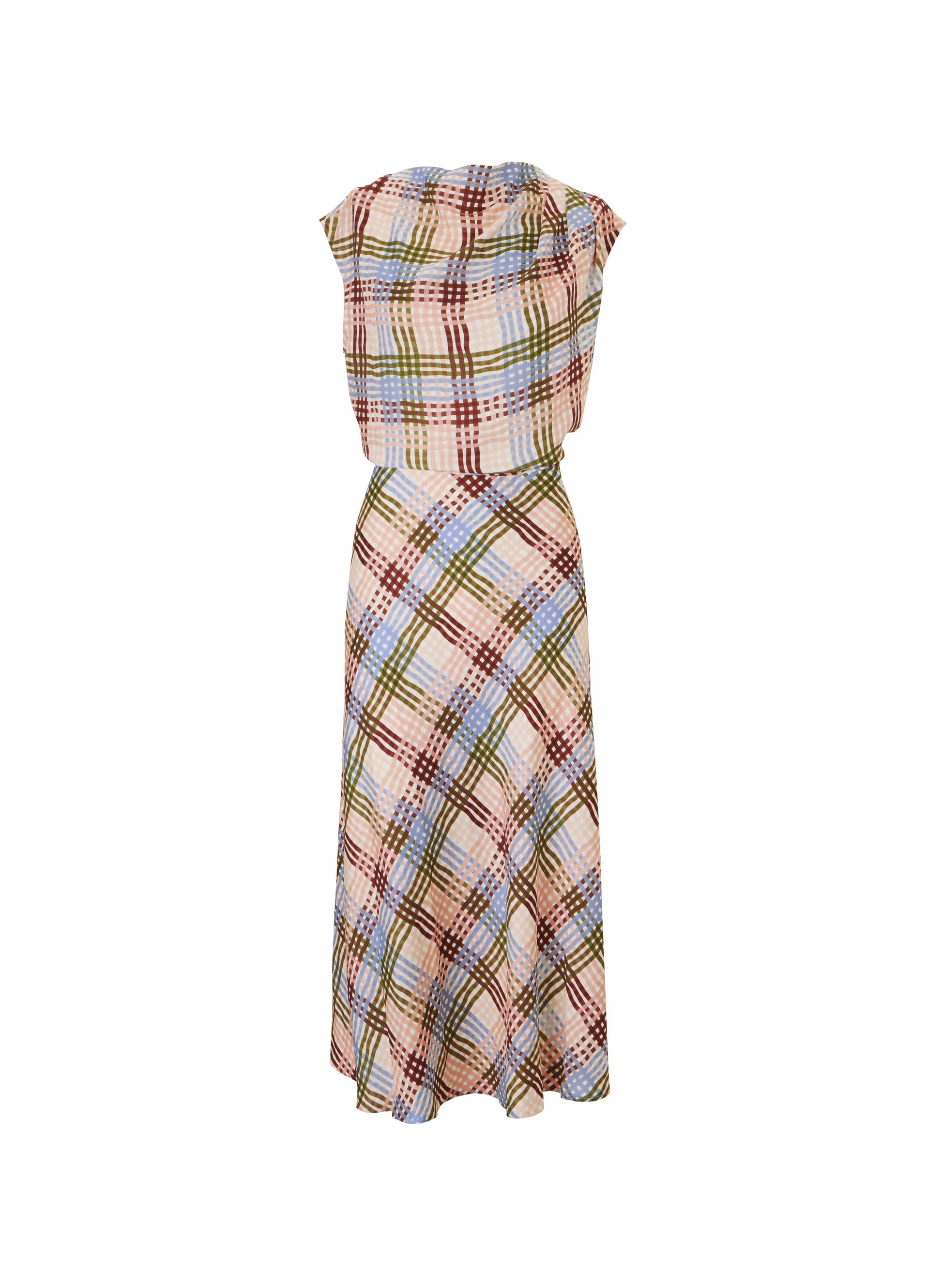 We're seeking warmer weather and the chance to welcome this light and summer-worthy dress into our wardrobes. In a peach toned check print and flowing soft twill fabric, it is the ultimate spring summer day dress. Its elegant cowl neck and waist defining shape can effortlessly be dressed up for weddings or other formal occasions too.