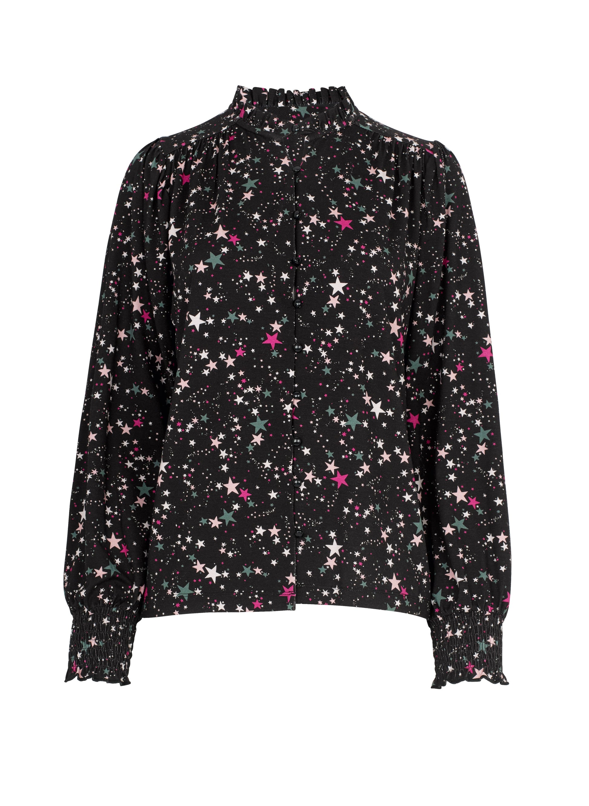 Our ever-popular signature blouse shape is back with a twist of rock n’ roll glamour. The Aaliyah features the same celestial print as the dress of the same name: shooting stars in magenta, rose, soft white and emerald on a black base. This feminine style comes with a subtly frilled collar, rouleau loop button fastenings and gathered detailing around the shoulders. Not only will your jeans and tailored trousers love it, but it will add a touch of fun to leather pants too.