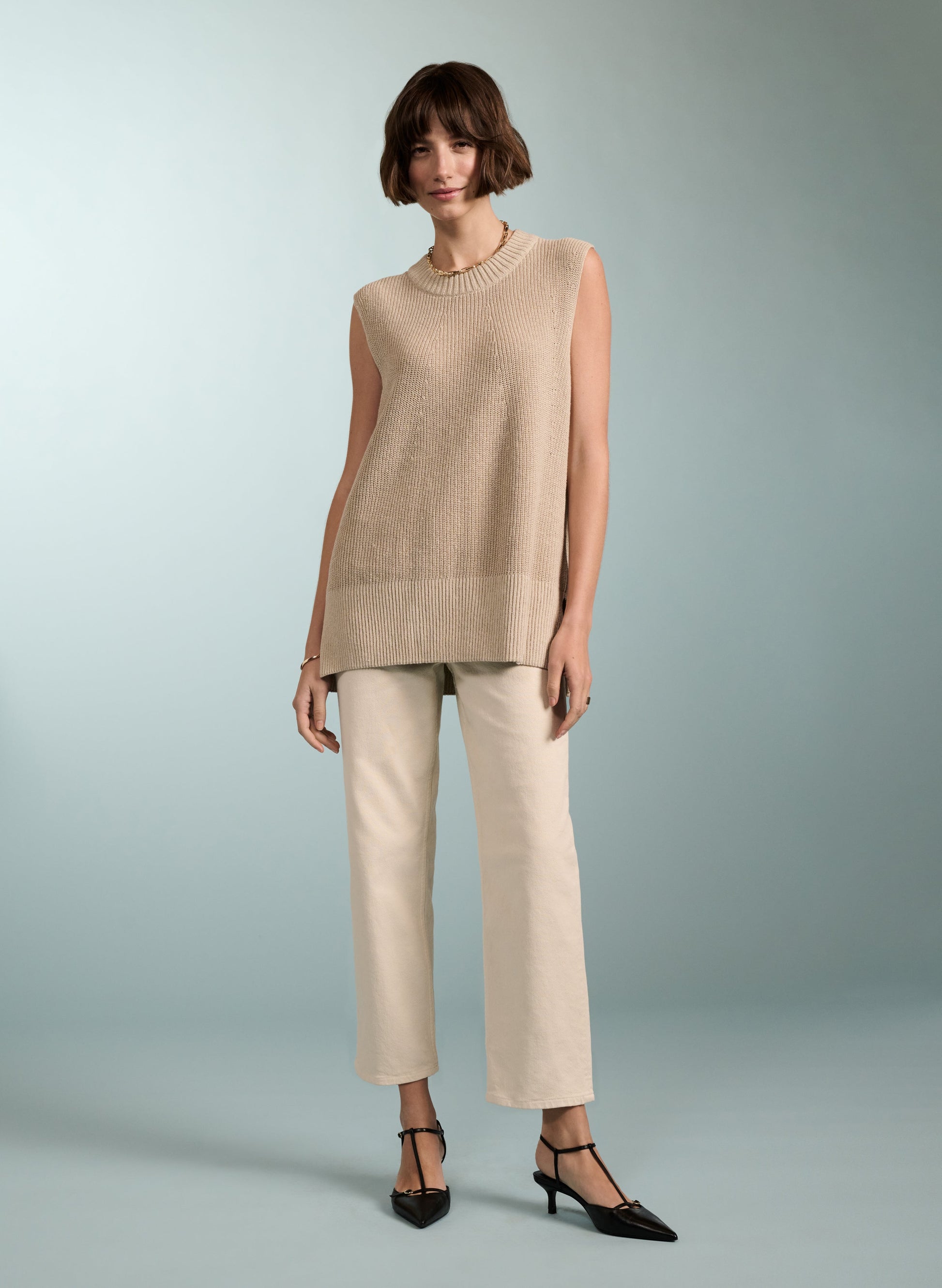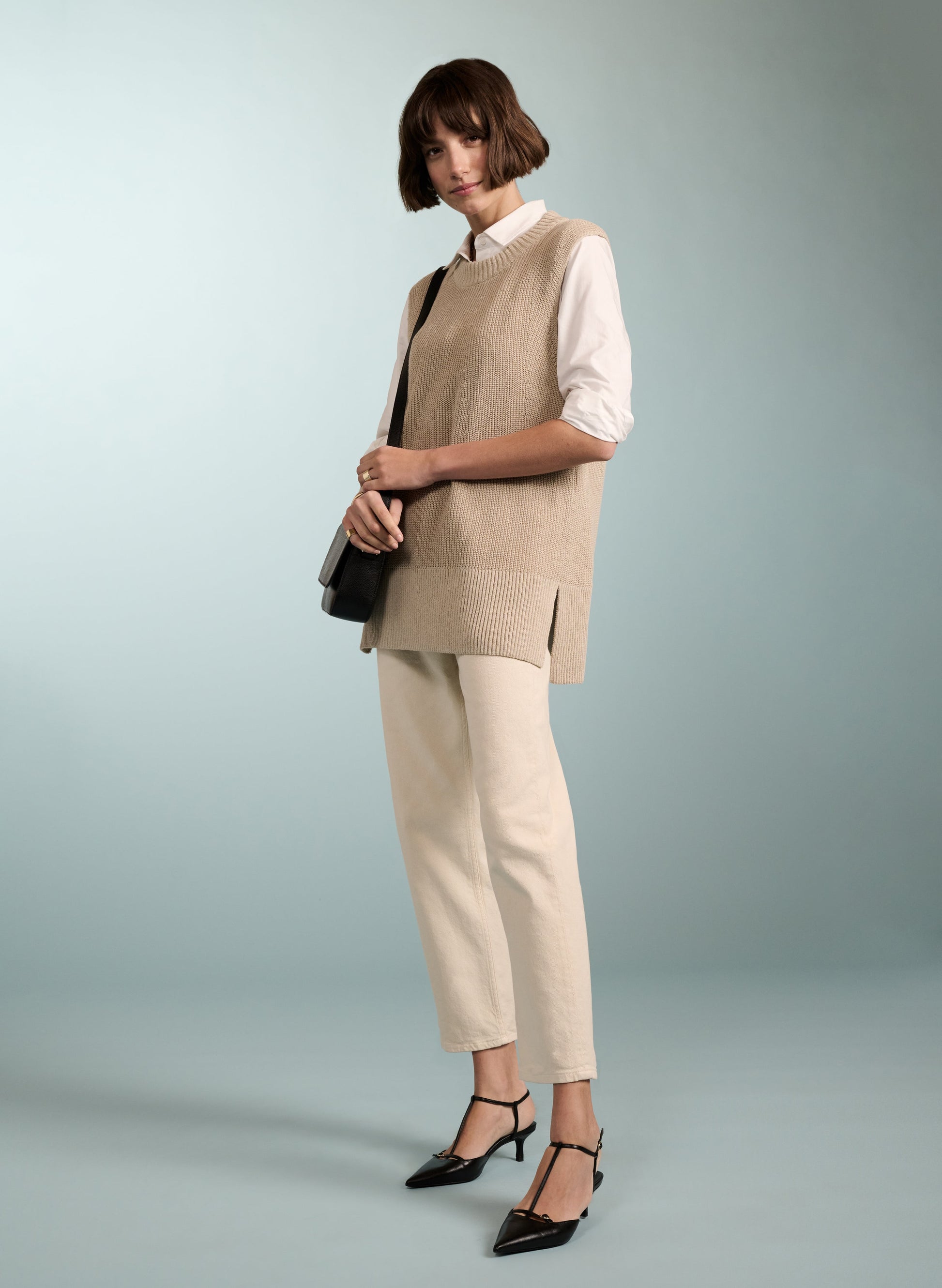 We’ve fallen hard for knitted tanks! Endlessly versatile, Rosalie is perfect for layering over shirts and tops and looks just as good worn on its own. We love its textured fisherman rib, which is woven from EcoTec and makes clever use of recycled fibres. Cut for a longer line, it skims the bum (so it works with leggings too) and features side splits.