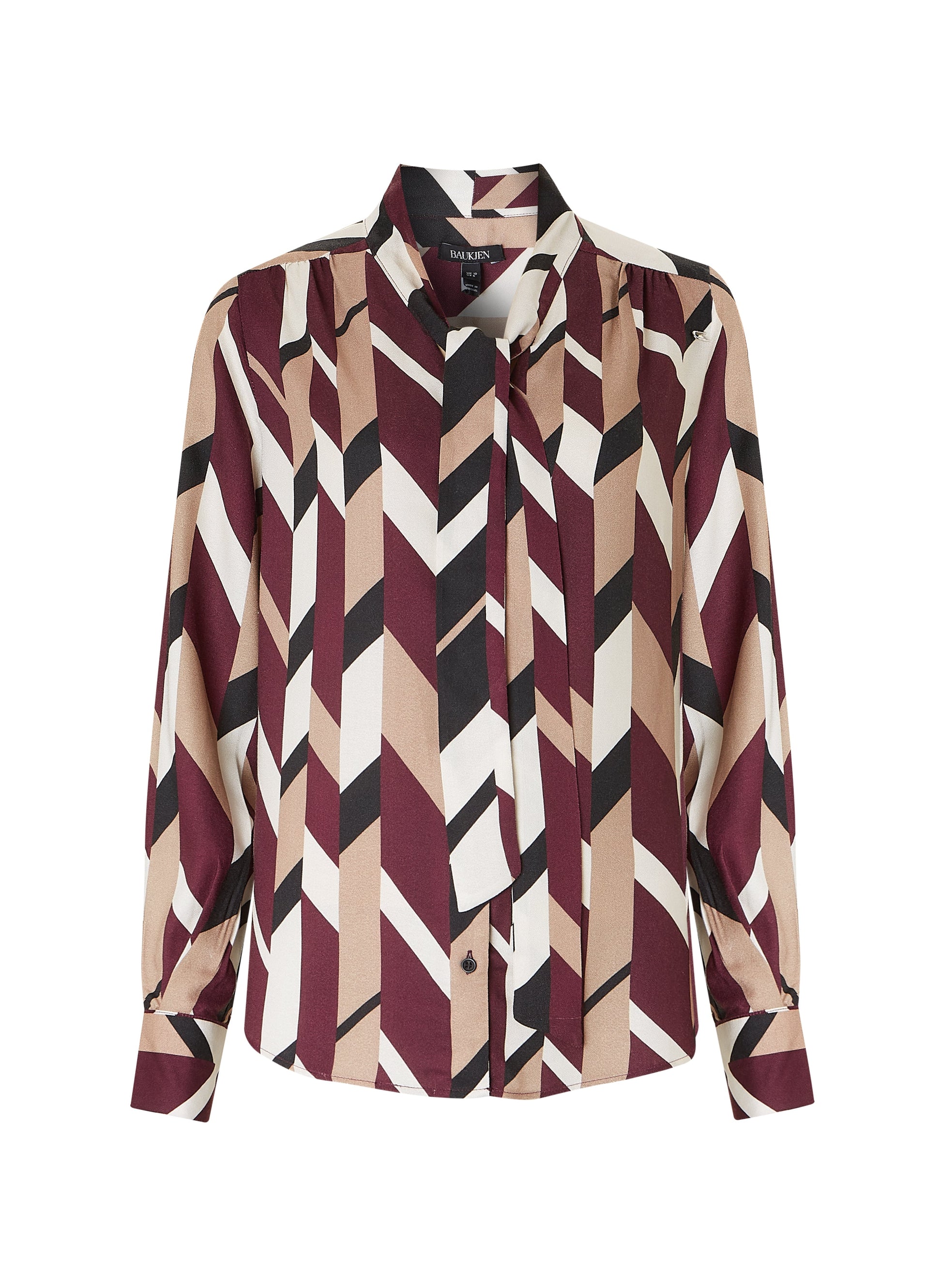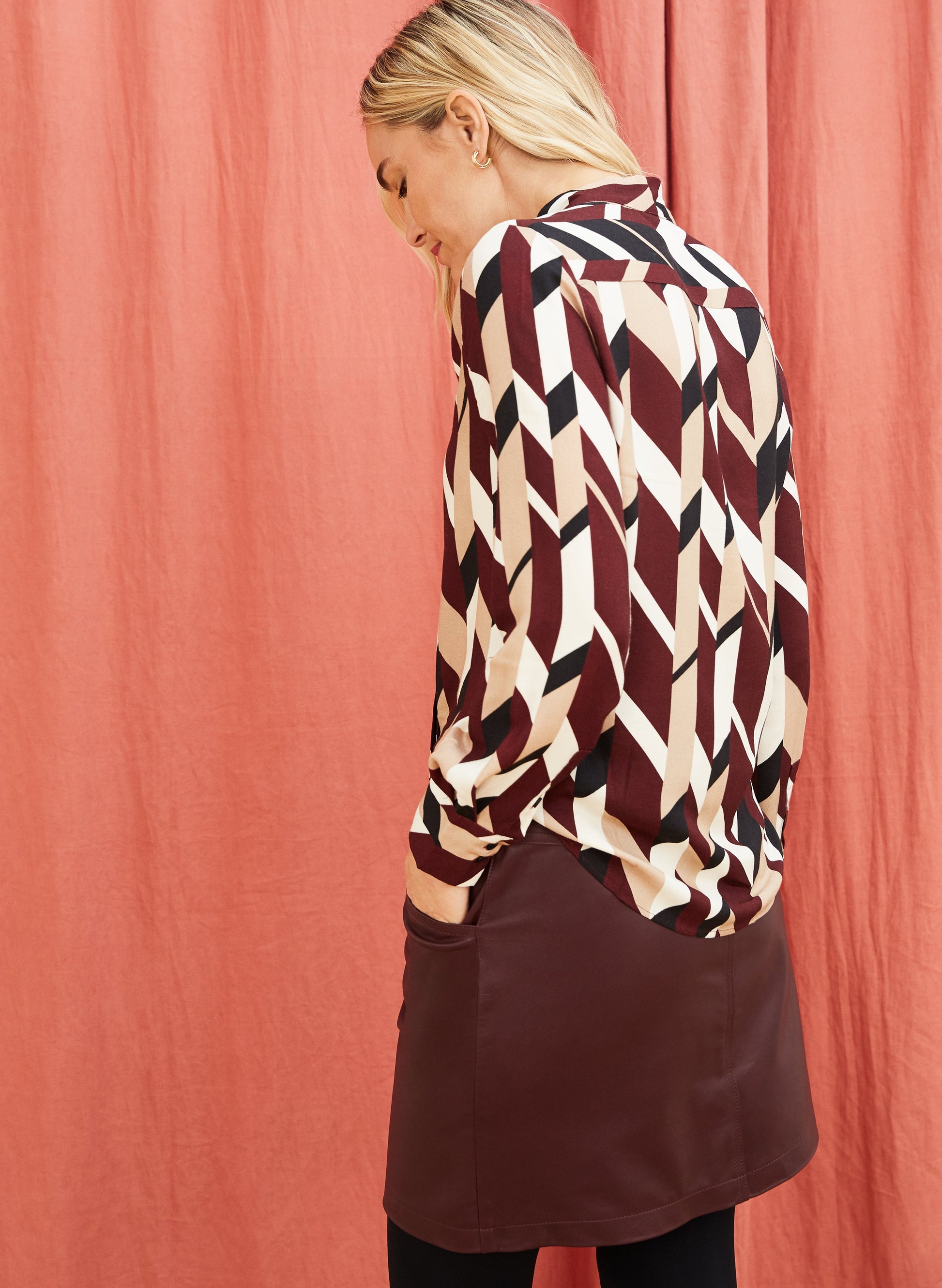 Set to be a compliment-magnet, the Skye print boasts a striking herringbone pattern with touches of burgundy, almond, black and soft white. Proudly crafted from biodegradable lightweight crepe using low-impact dyes, it features a v-shape neckline with a button-through fastening and a neck tie. A year-round multi-tasker, it’s chic tucked into a leather skirt for a meeting or for elevating a pair of jeans for brunch.