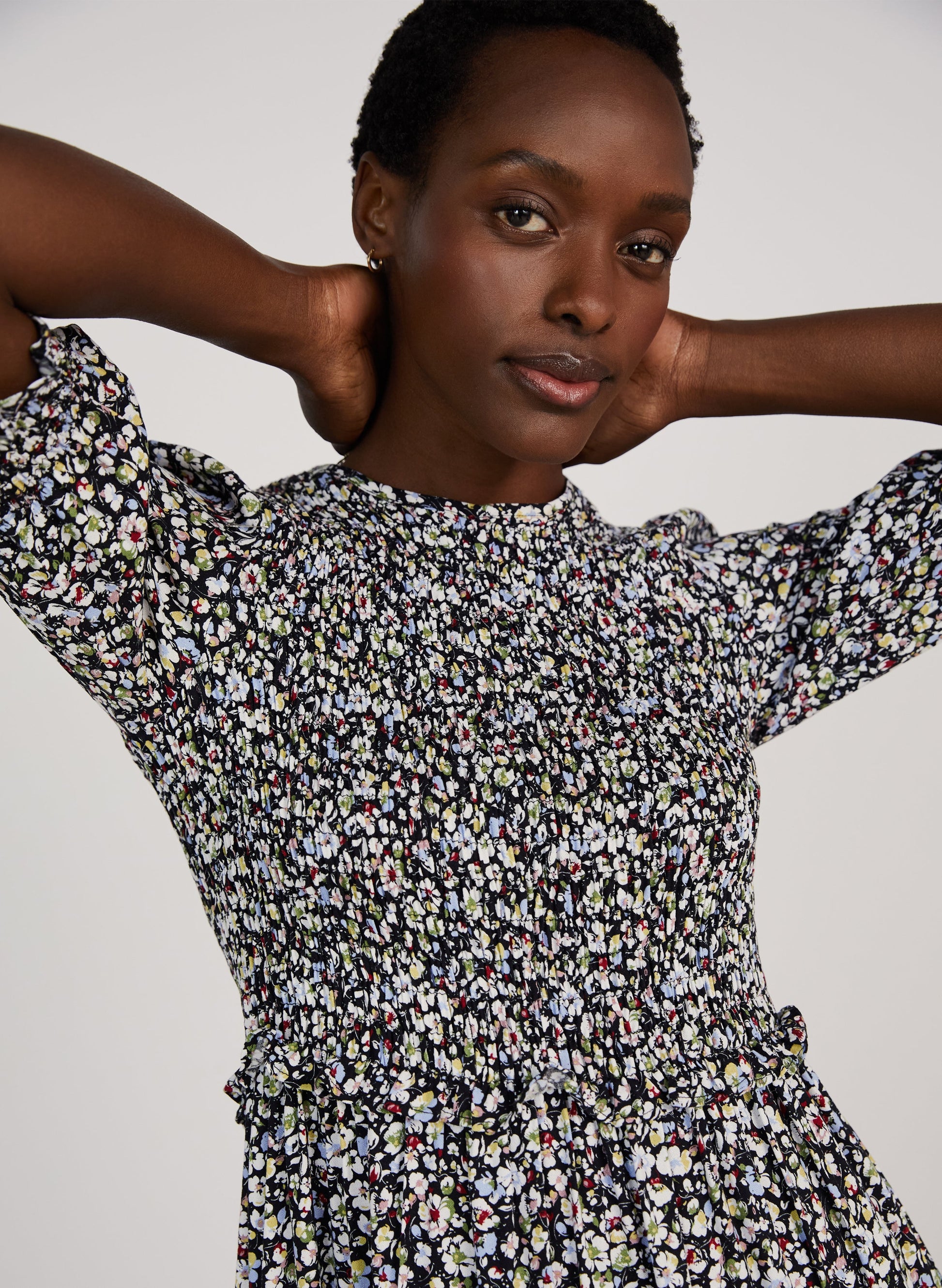 We’re mad about Soraya! Its smocked bodice is fitted yet comfortable, and its vintage-inspired floral print on a black base makes it an effortless style to transition from winter to spring in. We’ll be wearing it with boots and sneakers, biker jackets and cardigans, and ditching tights when the season switches.