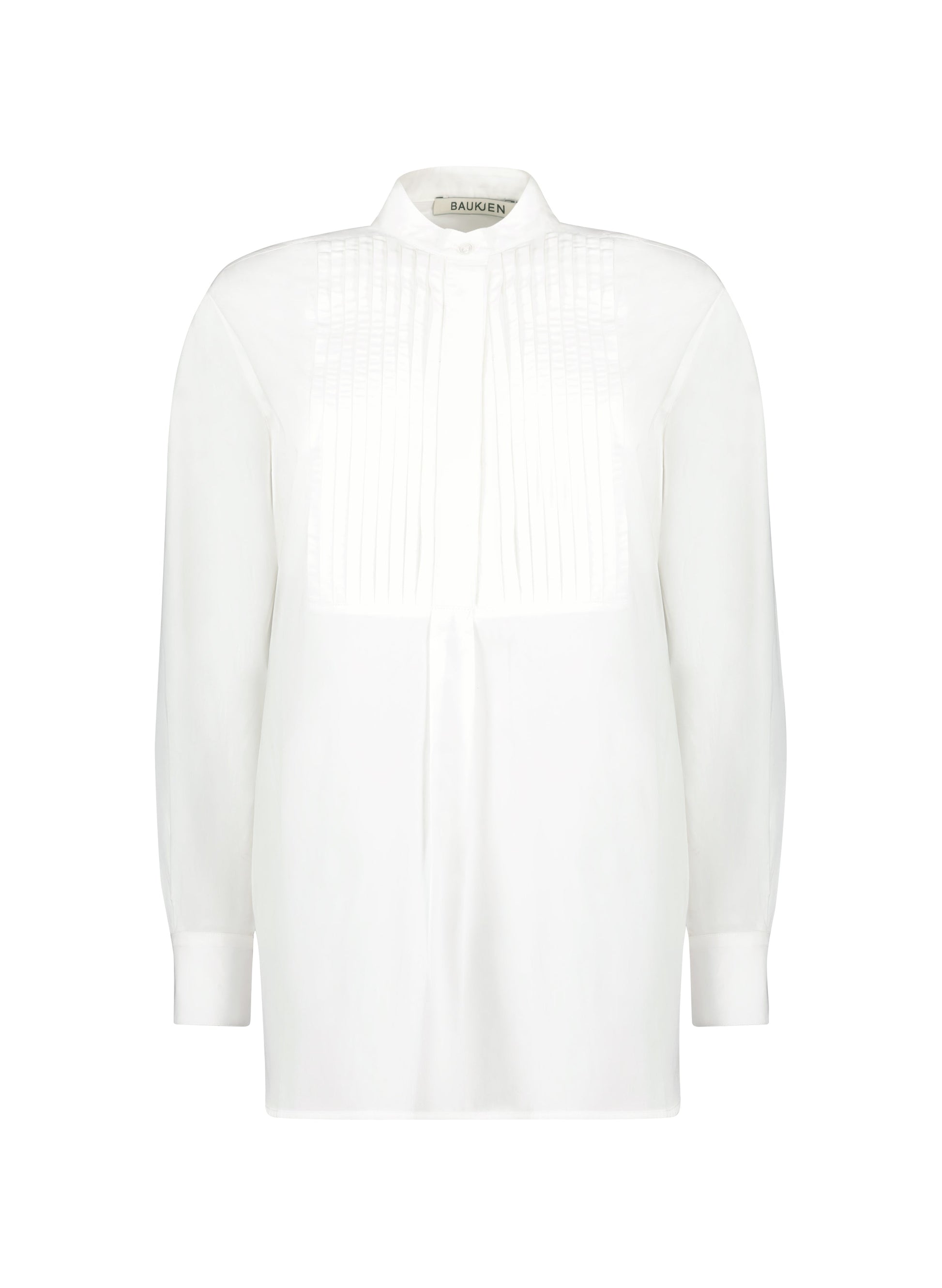 Inspired by a men’s vintage dress shirt, Tess is a contemporary take on an elegant classic. Crafted in the crispest, organic cotton, it features a pleated placket with buttons and a sharp stand collar. Cut for a longer line, it skims the bum and would look chic over our Liv Leather leggings, or a slim trouser. Suited to both work and evenings out, it is confidently chic.