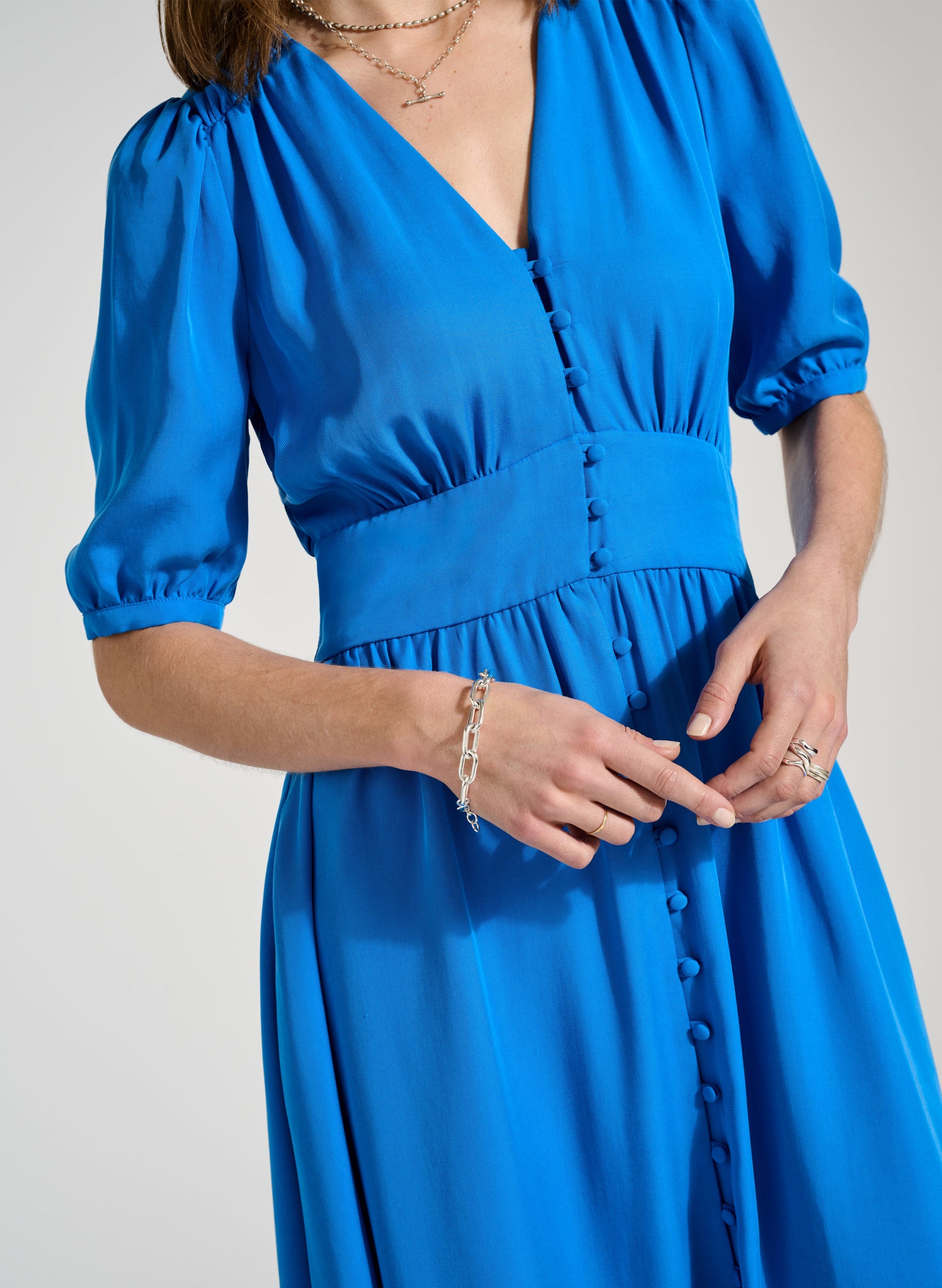 • Buttons through to the knee with rouleau loop fastenings
