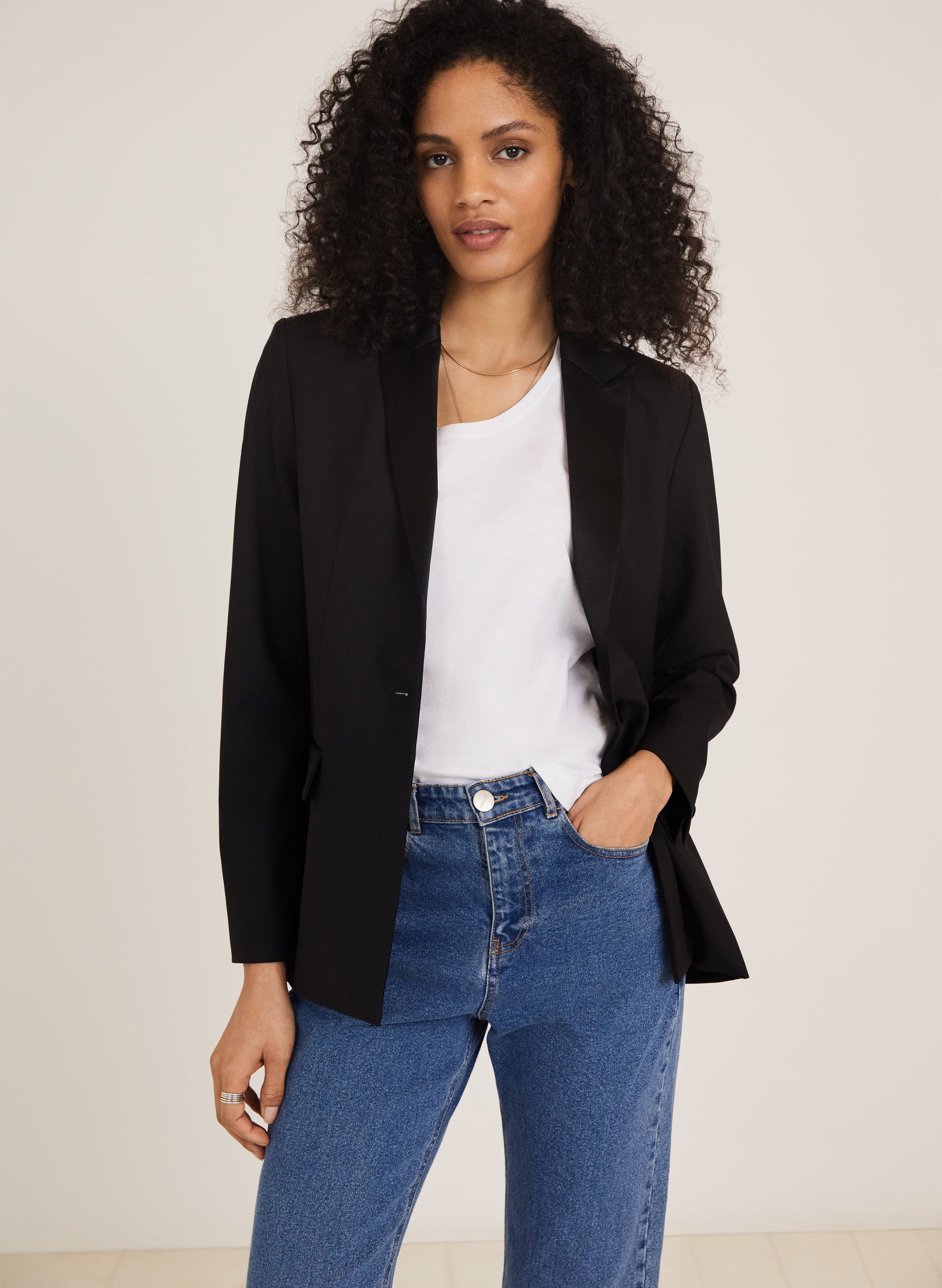 The Tria is a beautifully-cut blzaer, inspired by classic tuxedo suiting, so it really is timeless. Made from wool and over 50% recycled fibres, this fabric reduces the need for virgin resources. Cut for a boyfriend fit with shoulder pads for shape, we love it with a crisp white shirt over denim or tailored trousers for an authentically modern contemporary look